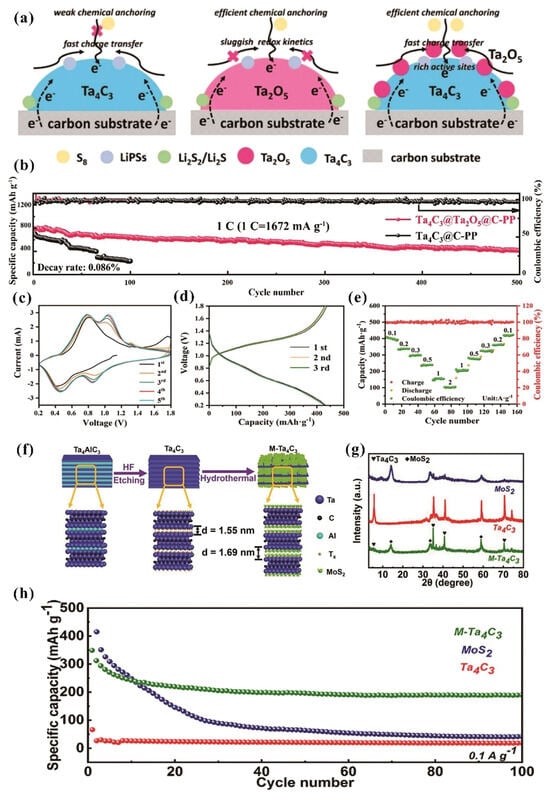 - Liang, Q.; Wang, S.; Jia, X.; Yang, J.; Li, Y.; Shao, D.; Feng, L.; Liao, J.; Song, H. MXene derivative Ta4C3-Ta2O5 heterostructure as bi-functional barrier for Li-S batteries. J. Mater. Sci. Technol. 2023, 151, 89–98. [Google Scholar] [CrossRef]