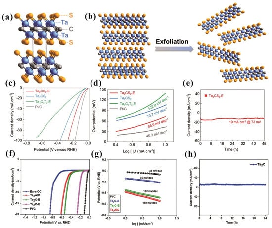 (a) Crystal structure of Ta2CS2. (b) The schematic illustration of exfoliation route for generating Ta2CS2-E nanosheets. (c) HER polarization curves and (d) Tafel slopes of Ta2CS2-E compared with other samples. (e) Stability study of Ta2CS2-E at an overpotential of 73 mV. Permission granted for reproduction []. Copyright (2021), Wiley-VCH. (f) HER polarization curves and (g) Tafel slopes of Ta2C-E compare with other samples. (h) Time-dependent current density curves of Ta2C-E. Permission granted for reproduction []. Copyright (2021), Elsevier.