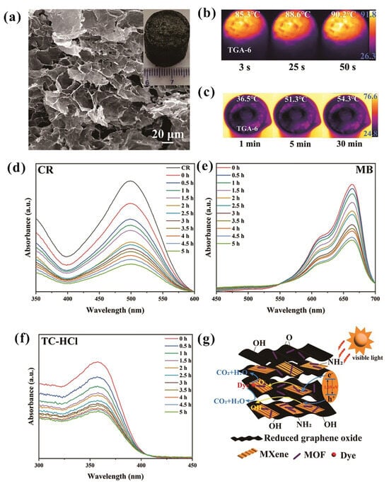 (a) SEM images of Ta4C3Tx/graphene aerogel. (b,c) Thermal infrared imaging and surface temperature analysis of Ta4C3Tx/graphene aerogel composites in the dry state at varying time intervals. Permission granted for reproduction []. Copyright (2024), Elsevier. UV–visible absorption spectra of (d) CR, (e) MB, and (f) TC-HCl with respect to irradiation time, demonstrating the photocatalytic degradation activities of NH2-MIL-88B/Ta4C3Tx/graphene. (g) Photocatalytic degradation mechanism of dye/drug on NH2-MIL-88B/Ta4C3Tx/graphene under visible light illumination. Permission granted for reproduction []. Copyright (2025), Elsevier.