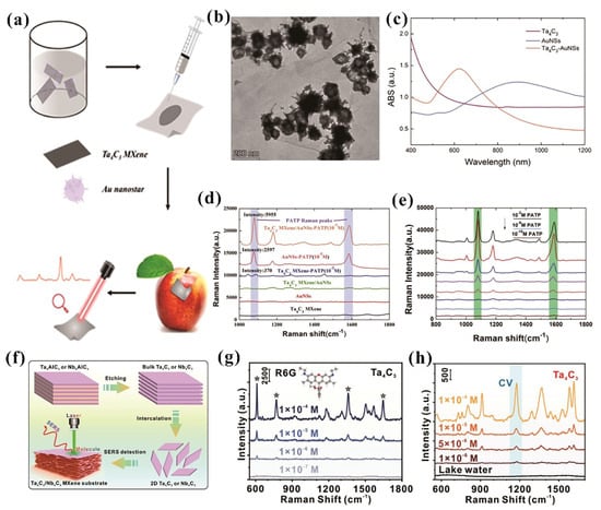 (a) Preparation of 2D Ta4C3 MXene/ANSs composites as SERS substrates. (b) TEM images of Ta4C3 MXene/AuNSs composites. (c) UV–vis absorption spectra of Ta4C3 MXene, AuNSs, and the Ta4C3 MXene/AuNSs composite structure. (d) Raman spectra of Ta4C3 MXene, AuNSs, Ta4C3 MXene/AuNSs, Ta4C3 MXene/AuNSs with 10−5 M PATP, AuNSs with 10−5 M PATP, and Ta4C3 MXene with 10−2 M PATP. (e) Raman spectra of Ta4C3 MXene/AuNSs for detecting various concentrations of PATP. Permission granted for reproduction []. Copyright (2024), American Chemical Society. (f) Schematic representation of the synthesis and SERS application for 2D Ta4C3 and Nb4C3 nanosheet. (g) Raman spectra of R6G with concentrations ranging from 10−4 to 10−7 M adsorbed on Ta4C3. (h) Raman spectra of CV with concentrations ranging from 10−4 to 10−6 M adsorbed on Ta4C3. Permission granted for reproduction []. Copyright (2024), American Chemical Society.