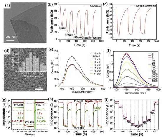 (a) TEM of Ta4C3Tx nanosheet. (b) Dynamic response curves of Ta4C3Tx to NH3 concentrations ranging from 65 to 325 ppm. (c) Repeatability test of Ta4C3Tx at 100 ppm NH3 over multiple cycles. Permission granted for reproduction []. Copyright (2024), Elsevier. (d) TEM of N-MQDs. (e) Time-dependent fluorescence quenching of N-MQDs by 100 μmol/L Fe3+. (f) PL emission profiling of N-MQDs with different concentrations (μmol/L) o of Fe3+. Permission granted for reproduction []. Copyright (2022), Elsevier. (g) The response and recovery durations, along with the response levels, for the NiWO4-Ta4C3 material (red curve) and Ta4C3 MXene nanosheet (green curve) humidity sensors. (h) Continuous working stability of the NiWO4-Ta4C3 (red curve) and Ta4C3 MXene (green curve) humidity sensors. (i) Resistance values of NiWO4-Ta4C3 humidity sensor at different humidities. Permission granted for reproduction []. Copyright (2023), American Chemical Society.