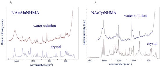 A comparison of the vibrational spectra of the dipeptides in polycrystalline form with the spectra of their water solutions reveals which modes are affected most by hydration (Figure 1A,B). Different conformations of dipeptides can coexist in water solution, their vibrational bands having similar wavenumbers. Determining their populations requires a detailed inspection of the vibrational spectra and understanding how they manifest through 1H coupling constants in nuclear magnetic resonance studies [38,39,40,41,42]. The analysis of the bands of amide III [39], as well as the analysis of amide I [40] recorded by NMR, infrared and Raman spectroscopy, showed that three conformations are present in water. These studies showed that the population of the α-conformation was low in both dipeptides (11% in NAcAlaNHMA and 7% in NAcTyrNHMA). Most conformations were distributed among polyproline and β-conformations in the Ramachandran plot (polyproline: 60% in NAcAlaNHMA and 46% in NAcTyrNHMA; β: 0.29% in NAcAlaNHMA and 47% in NAcTyrNHMA).