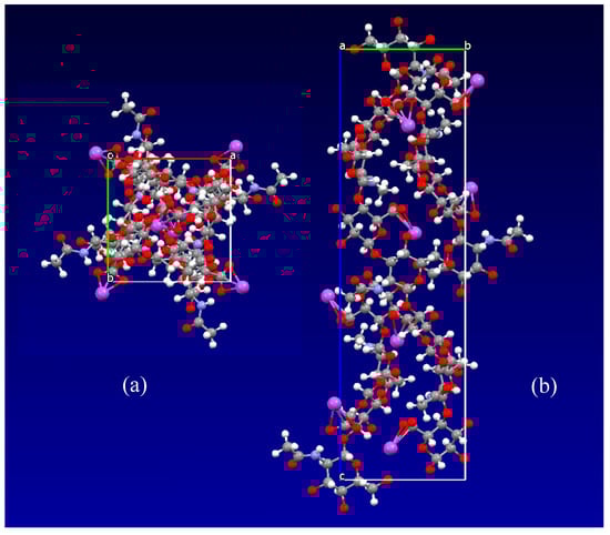 Illustration of sodium hyaluronate crystal structure created from data determined by Guss [26]: (a) view down c axis; (b) view along a axis. Figure prepared using Mercury program [45].