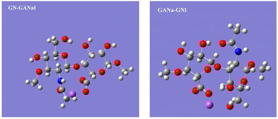 HA is a copolymer, and its building blocks were carefully optimized by Pogány and Kovács [37]. For the two most stable disaccharide units—N-acetyl-β-D-glucosamine-β-(1→4)-D-glucuronic acid sodium salt, GN-GANa1, and β-D-glucuronic acid-β-(1→3)-N-acetyl-β-D-glucosamine sodium salt, GANa-GN1—normal modes were calculated using Gaussian16 with the B3LYP functional and the 6-31++G(d,p) basis set. A scaling factor of 0.96 was applied to all calculated values for the sake of comparison with the experimental spectrum of sodium hyaluronate powder.