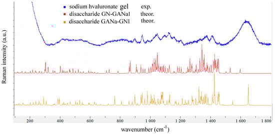 Since HA is a polymer of the [-A-B-]n type, where A is D-glucuronic acid and B is N-Acetyl-D-glucosamine, there are two types of glycosidic bonds: one connecting A to B, which is represented in the N-acetyl-β-D-glucosamine-β-(1→4)-D-glucuronic acid sodium salt, GN-GANa1, and the other between B and A, represented by the β-D-glucuronic acid-β-(1→3)-N-acetyl-β-D-glucosamine sodium salt, GANa-GN1 (see Figure 6). The geometric parameters for both disaccharide units were taken from the work of Pogány and Kovács [37], and their vibrations were calculated. The resulting scaled Raman spectra are compared with the Raman spectrum of 3.3 wt% HA gel in Figure 7.