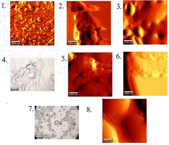 Atomic force microscopy allows for studying the morphology of soft samples in air, at room temperature, without the need for a vacuum, which is obligatory for scanning and transmission electron microscopy. When applied to diluted peptide solutions (0.1% wt) [60], or to hyaluronic acid solutions (100 μg/mL with MgCl2 added to reduce entanglement) [61], it can provide images of individual fibers. For the concentration ranges we studied, we observed homogeneous surfaces on the air-dried gels (xerogels) (Figure 8).