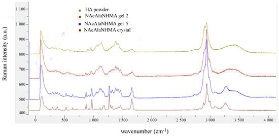 Comparison of Raman spectra of HA powder, NAcAlaNHMA gels 2 and 5, and NAcAlaNHMA powder.