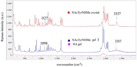 There were no significant differences in the Raman spectra of gels 2, 5 and 7 of NAcAlaNHMA (Figure 9, Supplementary Figure S1), whereas for NAcTyrNHMa gel 3 we found that the bands observed in the crystal at 1127 cm−1 (corresponding to δ(C-OH)) and at 3337 cm−1 (corresponding to ν(N-H)) shifted in the Raman spectrum to 1098 cm−1 and 3317 cm−1 (Figure 10). For gels 6 and 8 no significant changes in the Raman spectra of NAcTyrNHMA were observed (Supplementary Figure S2).