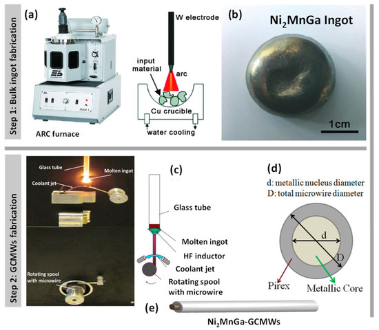 Illustration of the experimental facility and key steps involved in fabricating thin Ni2MnGa-glass-coated microwires. Panels (a,b) show the ARC melting furnace and the resulting bulk alloy ingot. Panel (c) depicts the Taylor–Ulitovsky method used for producing the glass-coated microwires, while panels (d,e) provide schematic illustrations of the Ni2MnGa-based glass-coated microwires themselves.