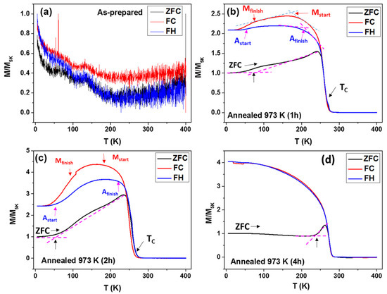 Zero-field-cooled (ZFC), field-cooled (FC), and field-heated (FH) magnetization curves measured under an applied field of 50 Oe. (a) As-prepared NiMnGa glass-coated microwires; (b–d) samples annealed at 973 K for (b) 1 h, (c) 2 h, and (d) 4 h, respectively.