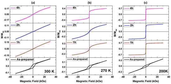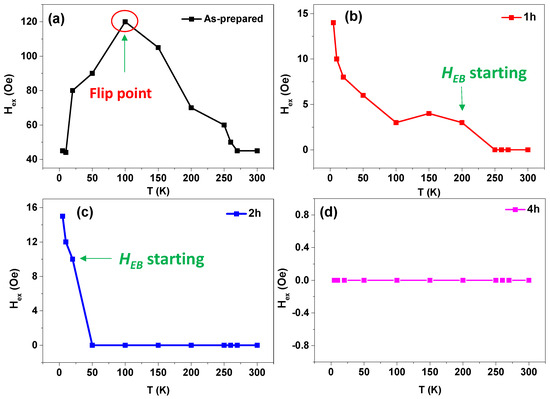 As illustrated in Figure 9, the as-prepared sample exhibits the highest HEB-value, compared to the annealed samples. Additionally, the HEB exhibits a temperature dependence with a distinct maximum around 100 K. For the annealed samples, the onset of spontaneous exchange bias appears below room temperature. Specifically, HEB starts to appear at 200 K and 20 K in the samples annealed for 1 h and 2 h, respectively. Interestingly, the 4 h annealed sample shows no observable spontaneous exchange bias. The HEB-value for the as-prepared sample is at least 40 times higher than that observed in the samples annealed for 1 h and 2 h. As shown in Figure 9b,c, the HEB(T) dependence exhibits a monotonic increase for the 1 h and 2 h annealed samples, with HEB increasing as the temperature decreases from 200 K to 5 K and 20 K to 5 K, respectively.