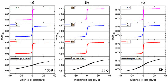 Hysteresis loops of as-prepared and annealed NiMnGa-based glass-coated microwires at 973 K for 1 h, 2 h, and 4 h measured at different temperatures: (a) 100 K, (b) 20 K, and (c) 5 K. M5K is defined as “the magnetic moment recorded at 5 K”.