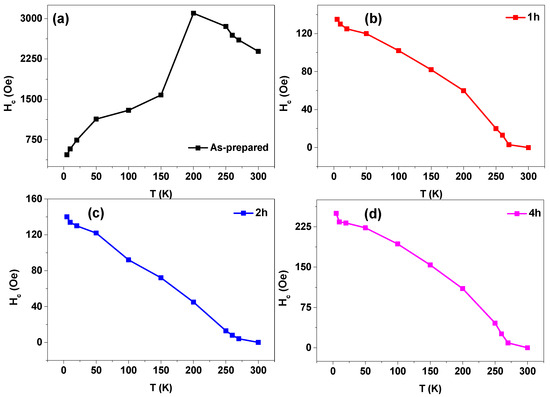 The Hc(T) (temperature-dependent coercivity) and Mr(T) (temperature-dependent remanence) dependencies for the as-prepared and annealed samples are provided in Figure 7 and Figure 8. The as-prepared sample shows the highest Hc -values for all the measured temperatures, where the highest Hc-value (Hc ≈ 3150 Oe) is observed at T = 200 K and the lowest Hc ≈ 420 Oe is observed at T = 5 K (see Figure 7a). The Hc-value for the as-prepared sample is 53 times higher than the Hc for the annealed samples for 1 h and 2 h and 13 times higher than for the annealed sample for 4 h measured at the same temperature (T = 200 K). In addition, the Hc(T) dependence is substantially affected by the annealing temperature and duration. For all the NiMnGa-based glass-coated microwires, i.e., as-prepared and annealed samples, the Hc(T) follows a monotonic increasing in its value by decreasing the temperature from 300 K to 200 K. Then, a sharp drop in the Hc-value with the T decreasing below 200 K is seen in the as-prepared sample (see Figure 7a). Meanwhile, a monotonic increasing in Hc values by decreasing the temperature is observed in all the annealed samples (see Figure 7b–d).