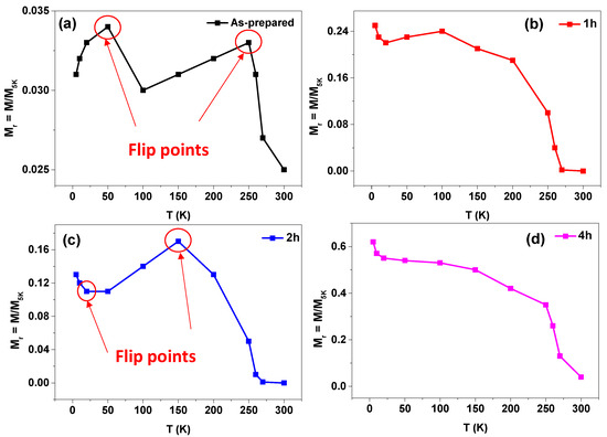 Regarding the Mr(T) dependencies, the as-prepared sample shows more complex Mr(T) dependencies compared to the annealed samples. Two flip points at T = 250 K and 50 K are observed, where the Mr(T) dependencies change (see Figure 8a). For the annealed samples, similar Mr(T) dependencies are observed for the samples annealed for 1 h and 4 h, where monotonic increasing in the Mr-values by decreasing the temperature from 300 K to 5 K is recorded (see Figure 8b,d). For the sample annealed for 2 h, two flip points are seen at T = 150 K and 20 K, where the Mr(T) dependencies change tendencies. The Mr and Hc(T) dependencies reveal the strong effect of the annealing condition on the magnetic behavior of the studied NiMnGa-based glass-coated microwires.