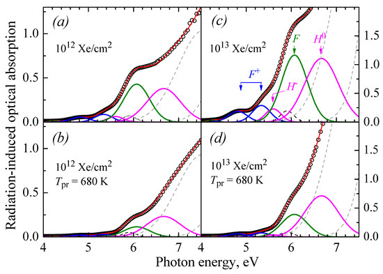 In the previous paper, we studied the evolution of optical absorption spectra with Xe-ion fluence and confirmed/proved the radiation-induced origin of the defects responsible for a RIOA above 4 eV (F+, F, H− and H0 centers) [39]. Note that the analysis of RIOA in neutron- or ion-irradiated corundum single crystals was always performed via spectra decomposition into Gaussian components related to different types of radiation defects [36,37,39,51,52]. Figure 1 presents the examples of the RIOA spectra decomposition into Gaussians in the crystals exposed to different Xe-ion fluences (Figure 1a,c) or after additional preheating of the irradiated crystals to prescribed temperatures Tpr (Figure 1b,d). The same parameters of Gaussian components (maximum position and bandwidth) were used in Ref. [39] and in the present study. The Gaussians marked by dashed lines belong to still-unidentified defects and are not the subject of this article. The F2-type dimer centers in different charge states possess characteristic absorption bands at 2.3–4.0 eV [22,24,32,36,37,47,51], their concentration in Xe-irradiated crystals is low, and these dimers are not considered in the present study.