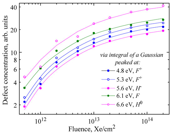 In Figure 2, the integral of a certain Gaussian (in arbitrary units) is taken as a concentration measure of the relevant Frenkel defects. At the same time, the concentration of paramagnetic defects—in particular, the F+ and H− centers—can directly be determined by the EPR method. Note that ion irradiation created defects only within a thin crystal layer and their absolute number in the crystal (number of unpaired spins) was significantly lower than in the case of neutron irradiation. Because of the features or relevant EPR spectra, only the signal of superoxide ions (an H− stabilized by a trapped hole) was clearly registered in our samples. At Φ = 1013 Xe cm−2, the concentration of H− interstitials was estimated as N = 1.5 × 1018 cm−3, the value approximately doubled for Φ = 1014 cm−2 (N = 3.2 × 1018 cm−3), and the concentration of reached N = 3.55 × 1018 cm−3 in the case of the highest Φ = 2 × 1014 cm−2. The accuracy of concentration estimation was about 15% (for details, see Ref. [39]). Note that in a neutron-irradiated corundum, the EPR signals of both the F+ and centers were clearly detectable and the concentration of these paramagnetic defects was practically equal [36,51].