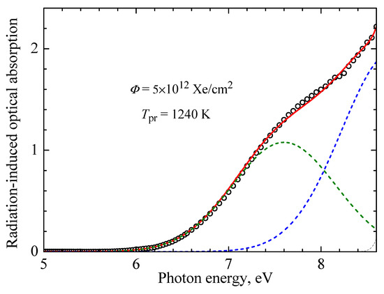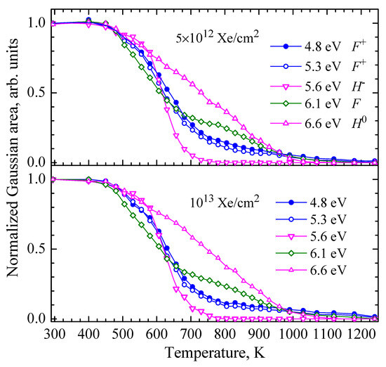 In contrast, the two kinetics of neutral H0 centers present significant challenges. At higher energies (above a certain threshold), experimental measurements of RIOA are not feasible. In the case of ion-irradiation, the influence (overlapping) of the Gaussians of unknown origin peaking above 7 eV (labelled by dashed lines in Figure 1) on the bands of the H0 and even F centers is significant. In a neutron-irradiated corundum, the isolated maximum of the F-absorption is clearly registered at 6.07 eV, and this RIOA band intensity decreases till 7 eV by more than two times [36,37,51,52]. On the other hand, there is no isolated F-band in the RIOA spectra of Xe-irradiated crystals (see Figure 1a,c); a relative contribution of high-energy Gaussians (tentatively connected with more complex structural defects) increases with Tpr (see Figure 1b,d). According to Figure 8, these intense Gaussians are clearly detectable even after Tpr = 1240 K, i.e., total annealing of the Frenkel defects under consideration.