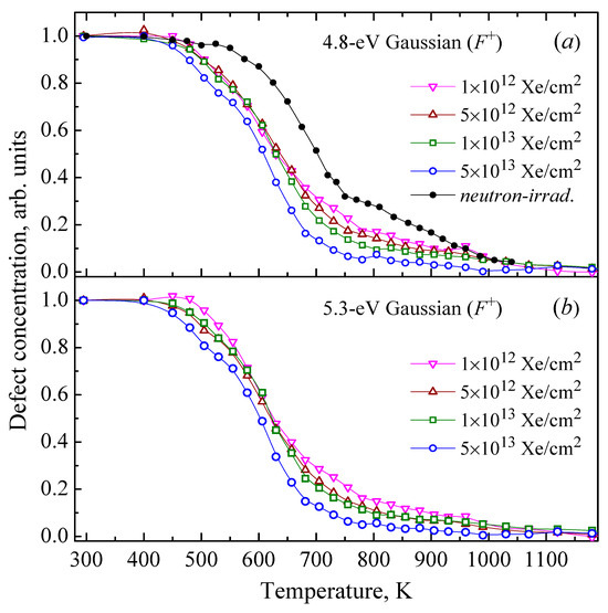 It is notable that in neutron-irradiated corundum crystals, intense EPR signals related to the F+ and H− () defects allowed for precise registration of the defect concentration dependence on the preheating temperature. It has been clearly demonstrated that such dependences for paramagnetic F+ and H− centers practically coincide with those constructed on the basis of relevant RIOA Gaussians [36,37,51]. Unfortunately, the EPR method was not applicable for thermal annealing in the case of Xe irradiation. Due to the small range of energetic Xe ions (around 13.5 μm), the absolute number of ion-induced defects was too low, up to two orders of magnitude lower with respect to the crystals homogeneously colored in a whole volume by fast neutrons. As a result, in the present study, the annealing of Frenkel defects was studied only via the defect-related RIOA Gaussians (with the band integral proportional to the defect concentration).