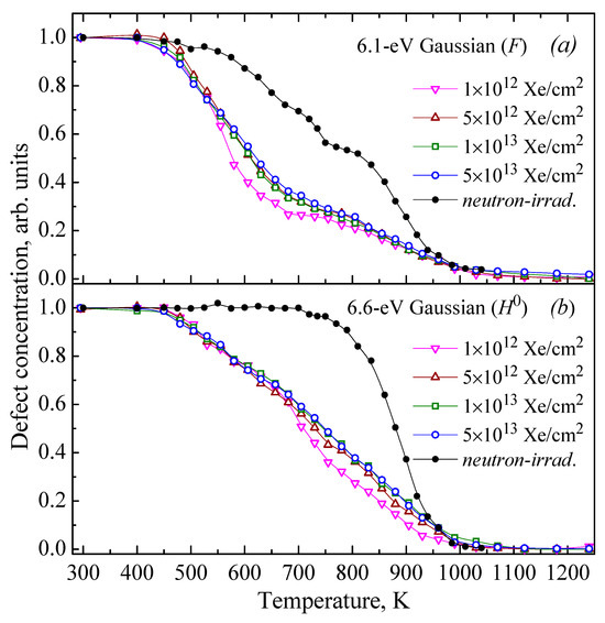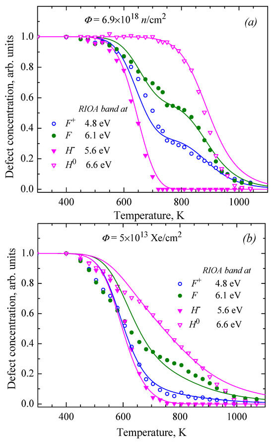 Figure 7 presents a comparison of the annealing kinetics for four types of Frenkel defects, whose recombination involves a complex interplay of cross-reactions, under two irradiation conditions: fast neutron irradiation (Figure 7a) and swift heavy ion irradiation (Figure 7b). Since the annealing kinetics are largely governed by mobile interstitials, particular attention should be paid to the RIOA bands corresponding to two differently charged interstitials: the band that peaked at 5.6 eV is related to the H− centers, while the maximum of the tentative H0 center absorption is around 6.6 eV.