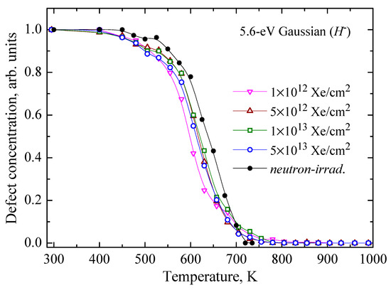 It is clearly seen that only the annealing kinetics of the H− centers (RIOA at 5.6 eV) were very similar for both cases of irradiation (see Figure 6), while in general, the annealing of other Frenkel defects in ion-irradiated crystals started at lower temperatures than in neutron-irradiated crystals (see Figure 4 and Figure 5). Note that the thermal annealing kinetics of neutron-induced Frenkel defect pairs (F+-H− and F-H0) have already been modelled in terms of diffusion-controlled biomolecular reactions and the involvement of differently charged mobile oxygen interstitials [37,51,52]. The present study is a logical continuation of such theoretical analysis for the case of oxygen-related defect creation by energetic ions with different fluences.
