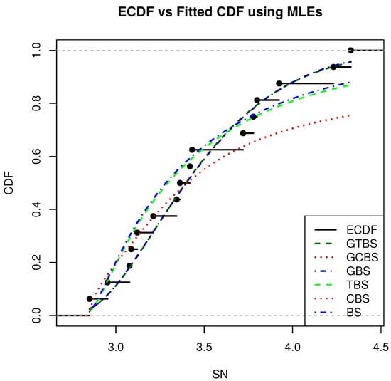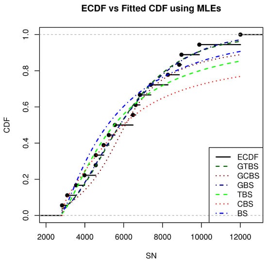 The parameters of the GTBS distribution and its sub-models per Table 1 are estimated under the maximum likelihood framework as part of this study. The Kolmogorov–Smirnov (KS) [62,63], Anderson–Darling (AD) [64], and Cramér–von Mises (CVM) [65,66] statistics are used to check the goodness-of-fit of the fitted models. A parametric bootstrap approach with resamples is considered for calculating the p-values for these statistics. The latter statistical approach is implemented as follows. First, the GTBS model parameters and are estimated from the observed data, producing and , while the estimator of is obtained via profiling. Afterward, for the sub-model, part of the model parameters is estimated since some of the parameters become known; for example, in the case of the CBS distribution, and , while and in the case of the BS distribution. Consequently, the obtained estimators are then utilized to acquire B bootstrap samples from the underlying model. The goodness-of-fit statistics are computed for each bootstrap sample, and this procedure is repeated B times to approximate the distribution of test statistics. The bootstrap-based p-value is calculated as the proportion of bootstrap statistics exceeding the observed test statistic. For additional details and information about bootstrapping, readers may refer to [67,68,69].