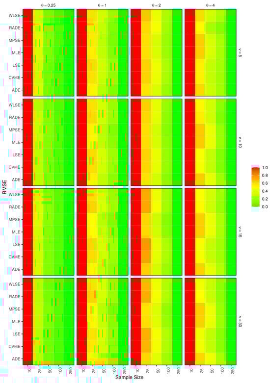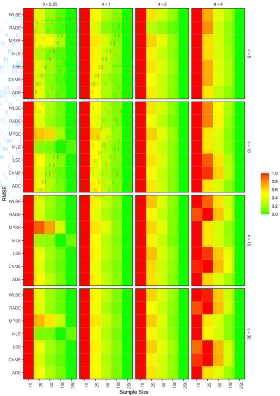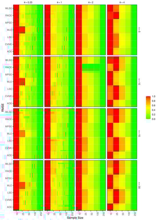 RMSEs for the estimators of obtained using simulation. All methods behave similarly for small values of . When the value of starts to increase, both MLE and MPSE outperform the remaining estimation techniques; however, when the value of dramatically increases, some of the other estimation methods provide better estimates than the MLE and MPSE.