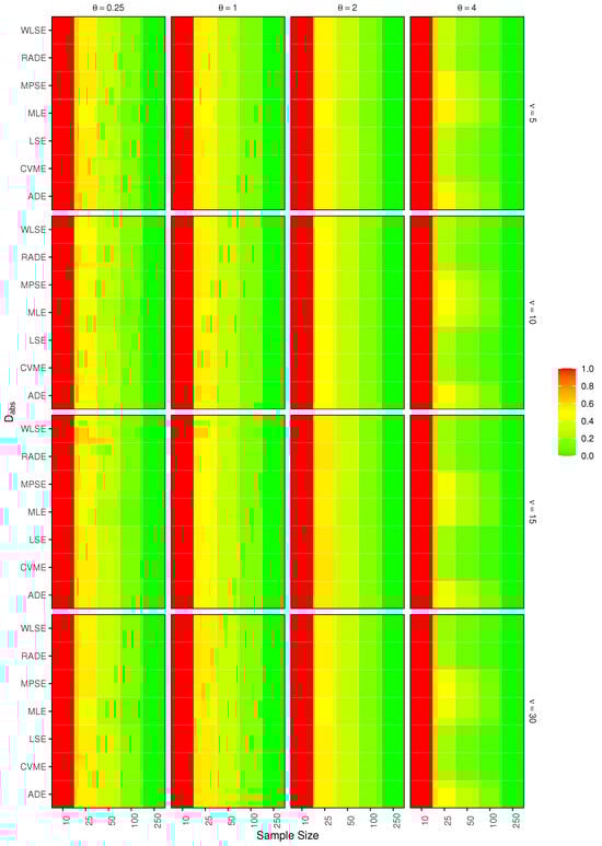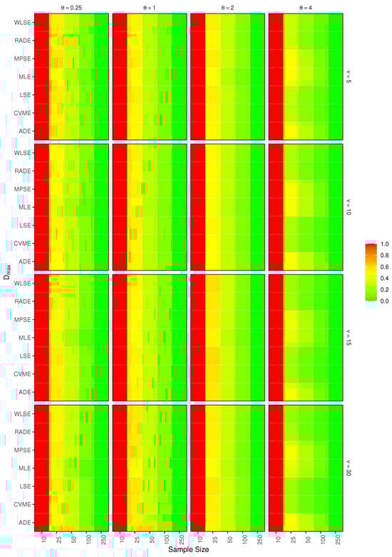 Simulated maximum absolute difference between the actual and fitted CDFs. Again, for small values of , MLEs surpass the remaining estimates, while for large values, MLEs, MPSEs, and ADEs slightly did not perform well. For large sample sizes, all methods perform similarly.