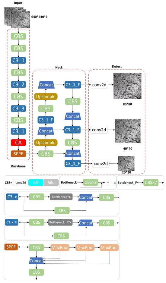 The detection head is the output layer of the object detection algorithm and is responsible for generating detection boxes and category information for targets. The Head module usually includes two parts: a regression head and a classification head. The regression head predicts the position information of targets, such as the coordinates and sizes of detection boxes, while the classification head predicts the category information of the targets. Different convolutional layers can be combined to concatenate and output heads of different sizes. The CBS module consists of convolutional layers, BN layers [16] and SiLU activation functions [17]. The role of the CBS module is to enhance the nonlinear ability and feature representation ability of convolutional layers, increase the network’s expressive power and enable it to better adapt to various object detection tasks. The C3 module consists of three convolutional layers, with each convolutional layer containing BN layers and SiLU activation functions. The SPPF module is used for spatial pyramid pooling and is composed of pooling layers of different scales, each with different stride and kernel sizes. The SPPF module extracts features of different scales and can reduce the dimensionality of features without changing the size of the feature maps, thereby improving the network’s detection accuracy and efficiency.