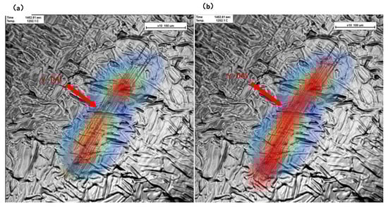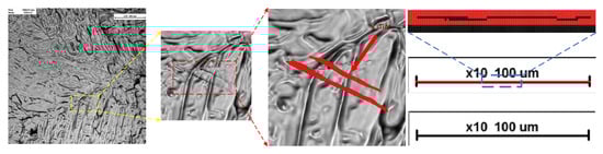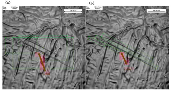 By examining the relationship between the magnification scale shown in the scanning electron microscope (SEM) images and the number of pixels, the actual lamellar length scale could be determined to be 0.47 μm/pixel. When selecting a clear key frame from the video, as shown in the Figure 10, the YOLOv5-obb network detected the lamellar microstructure and extracted the contour features. The number of contour pixels obtained was calculated in proportion to the scale, resulting in lamellar lengths of 95.71 μm and 71.43 μm for the longer and shorter ones, respectively.
