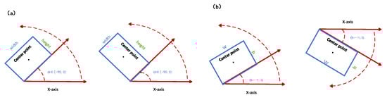 - Long edge-defined method: The angle is defined as the angle between the long edge of the rectangular box and the x axis. Therefore, the angle range is [−90, 90], as shown in Figure 3.