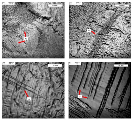 The focus of this study is on the γ-TiAl alloy high-temperature precipitate phase. Utilizing a combination of high-temperature in situ observation and high-temperature quenching, the lamellar microstructure of the alloy was observed and characterized at both macroscopic and microscopic levels using scanning electron microscopy, the electron backscatter diffraction (EBSD) technique and transmission electron microscopy (TEM). The morphological characteristics of the precipitated lamellar structures are illustrated in Figure 7, which presents electron microscopy images acquired at magnifications of 5×, 10×, 20× and 35×. Both the in situ recorded videos and subsequently segmented image frames maintained a uniform resolution of 1024 × 1024 pixels. The lamellar structures typically manifest as clustered assemblies, exhibiting distinct needle-like protrusive morphologies that grow along specific crystallographic orientations, demonstrating directional preferential growth behavior. In Figure 7, A1, A2, A3 and A4 represent some lamellar structures under various magnification ratios.