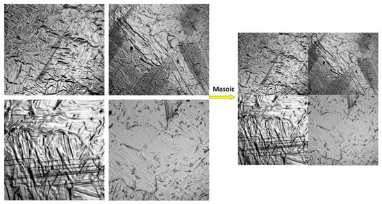 To systematically document the precipitation behavior of γ lamellae, a computerized imaging system was deployed to record the in situ evolution process within the 1260–1280 °C temperature regime. The obtained time-lapse videos served as the primary data source, from which individual frames were extracted to generate a series of 1024 × 1024 pixel grayscale images, comprehensively capturing the entire precipitation process from the initial nucleation to the complete coverage of the metal surface by the lamellar microstructure. Following a meticulous manual curation process to eliminate redundant and highly similar images, data augmentation techniques were applied to expand the dataset, resulting in an initial database consisting of 800 representative images. This dataset was subsequently partitioned into training (80%), validation (10%) and testing (10%) subsets. The training and validation subsets were utilized iteratively for model training and performance evaluation during each training epoch, while the testing subset was reserved for the final, unbiased assessment of the trained model’s detection accuracy. Data augmentation techniques generate new images by applying transformations such as rotation, cropping, splicing, translation and color adjustment to original images. By increasing the dataset size and diversity, these methods enhance the generalization capability of deep learning networks, effectively mitigating overfitting and improving model robustness. For YOLOv5-obb network training, mosaic data augmentation is applied during image input, a technique first introduced in the YOLOv4 architecture. As illustrated in Figure 8, this approach involves specific mosaic-style image processing to augment training data, optimizing model performance through enhanced input variability. The training and validation sets are used for model training and evaluation after each training epoch, while the testing set is reserved for the final evaluation of the detection performance of the trained model.