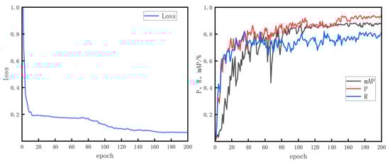 In this experiment, the neural network was trained for 200 iterations. The changes in various parameters obtained during network training are depicted in Figure 9. During the first 100 iterations, the precision (P), recall (R) and mean average precision (mAP) exhibited a gradually oscillating upward trend. The convergence speed of the loss value was relatively fast. Near iteration 150, the metrics began to stabilize, with the final network model achieving stable P, R and mAP values of 93.6%, 81.5% and 88.2%, respectively. The loss value fluctuated around 0.06.