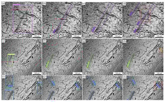 Comparison of four types of network detection effects for the lamellar microstructure. (a,e,i) YOLOv5n; (b,f,j) S2A-Net; (c,g,k) ReDet; (d,h,l) YOLOv5-obb.