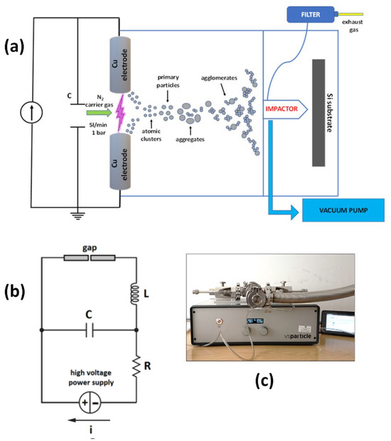 A schematic of the deposition equipment can be visualized in Figure 1a. The equivalent electrical circuit scheme of the spark generator is shown in Figure 1b. This circuit is simple yet ingenious at the same time. The spark itself acts as a switch and requires no fast-switching electronics. The current source charges capacitance C and a spark occurs when its voltage reaches the gas breakdown value, then the capacitor is discharged, and the process is repeated with a specific frequency. Figure 1c shows a photograph of the VSP-G1 nanoparticle generator employed in this work.