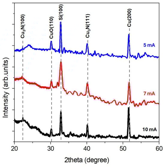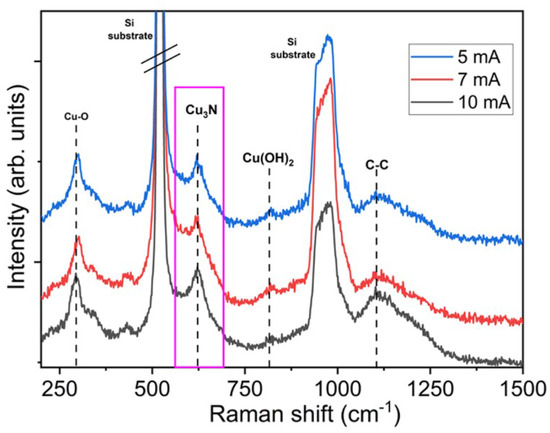 The peak detected at around 620 cm−1 can be assigned to the copper nitride phase (the pink box in the Figure), specifically to the stretching mode of a Cu-N bond [22,23,24]. The slight shift towards a lower wavenumber could be attributed to deviation from a stoichiometric compound, i.e., a Cu-rich nitride structure [12]. The Raman peak around 985 cm−1 is attributed to silicon substrate [25]. The band located at around 300 cm−1 is a characteristic vibration of a monoclinic CuO crystal [26], specifically Ag Raman-active mode, confirming the presence of this structure hypothesized by XRD analysis. A peak around 800 cm−1 is also detected, very small at the lowest spark current and more visible at the highest one. It can be attributed to the unintentional formation of Cu(OH)2 on the surface after the exposure of the nitride films in air [27,28]. The broad band around 1100 cm−1 belongs to C-C stretching modes due to surface carbon-based adsorbates from the atmosphere [29]. These results are in good agreement with the XRD analysis.