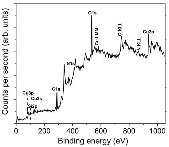 X-ray photoelectron spectroscopy (XPS) was employed to investigate the surface chemistry. The survey spectrum for a representative as-received sample (10 mA), shown in Figure 4, evidences the spectral signatures attributable to all the expected elements, i.e., Cu, N and O, together with other possible elements detectable on the sample’s surface.