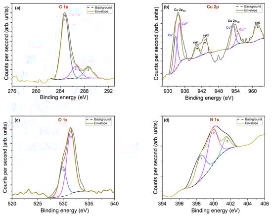 The carbon trace detected in the survey is attributable to the presence of organic contaminants introduced during the handling process or CO2 adsorbed from the atmosphere, as found in the Raman spectra. The high-resolution spectra of C 1s, Cu 2p, O 1s, and N 1s are shown in Figure 5.