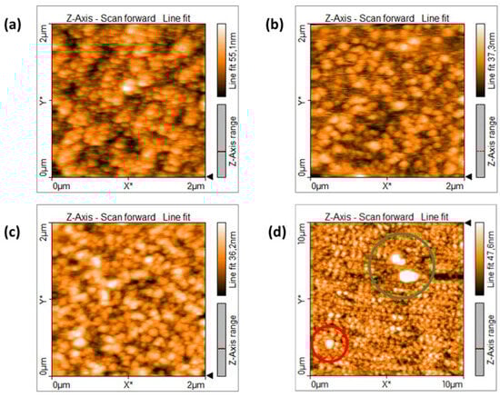 This means that for all the experiments, the discharge voltage is equal to 1.95 kV and the mean spark energy is about 47.5 mJ. The tuning of the current influences the sparking frequency, being equal to . As a matter of fact, it is equal to 100 Hz, 150 Hz and 200 Hz at 5 mA, 7 mA and 10 mA, respectively. At the same time, the aerosol concentration is affected, too. The Cu NP mass production rate (M) is proportional to spark repetition frequency f and electrode mass ablated per spark ∆m, which increases linearly with the spark energy [50]. It is described by the formula . In our experimental conditions, the spark energy is always the same, as previously discussed; therefore, ∆m is constant for all spark currents. The frequency, instead, changes at each deposition process, specifically following the same trend of the current. Therefore, the increase in the spark current leads to higher NP mass production rate M, increasing the probability that the ablated particles collide and agglomerate, generating larger aggregates, as observed by both AFM and SEM analyses.