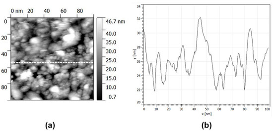All the deposited nanoparticle layers appear continuous and uniform on the silicon substrate while showing a co-presence of aggregates and smaller particles. The particle aggregates change their dimension according to the current. At the highest Ispark = 10 mA (Figure 6c), their size falls in the interval 100–300 nm, which decreases down to 80–160 nm at 7 mA of spark current (Figure 6b) and reaches the lowest values between 50 nm and 130 nm at the lowest current of 5 mA (Figure 6a). The increase in the current also causes a slight rise in the surface roughness, from 5 nm (at 5 mA) to about 8 nm (at 10 mA). AFM analyses also revealed, for all samples, the presence of spheres (few hundred nm in diameter) and agglomerates (sizes from a few hundred nm to few mm) randomly distributed over their surface (see red and green circles in Figure 6d, respectively, of the sample ablated at a current of 10 mA, taken as representative). They are known as “splashing particles”. By the use of STM, the individual size and size distribution of the particles were better analysed. Figure 7 displays a representative STM image (size scan 100 × 100 nm2, Figure 7a) carried out at a tunnelling current of 60 pA together with a profile section (Figure 7b) corresponding to the white dotted line. The images clearly show how the aggregates are composed of sub-10 nm particles, resulting in an average size equal to (6.6 ± 0.7) nm, confirming the small size of NPs at the selected gas carrier flow.