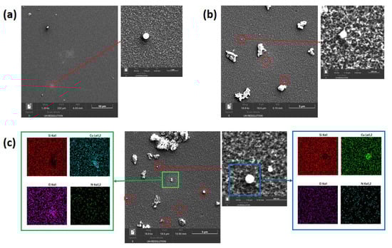 All films appear almost uniform on the silicon substrate, as AFM showed, too. The presence of randomly distributed small self-assembled splashing particles of varying diameters in the range 100–400 nm can be observed, in line with AFM scans. These spheres are evidenced by red circle in the figure, and they have different densities according to the ablation process conditions. Specifically, it decreases by diminishing the spark current. A density of (120 × 104) spheres/mm2 can be counted for the sample deposited at 10 mA of spark current, which decreases down to (60 × 104) spheres/mm2 at 7 mA and finally down to (2 × 104) spheres/mm2 at 5 mA. The origin of these round NPs is not easy to understand as spark discharge is a very complex process. Some authors [18,40] describe two different mechanisms occurring in spark discharge that can form spherical NPs with diameters of several hundred nm. They can be “primary particles”, made exclusively of pure metal from the electrodes, that are formed by the collision of smaller spherical particles and undergo complete coalescence; alternatively, they can form parallel to the evaporation–condensation process by the separation of the material directly from the locally heated electrode surface. For the latter mechanism, the authors observed that the dimension of these large “solidified droplets” range from 100 nm to a few microns and their number is negligible compared to that of NPs. Splashing particles coexist with NP agglomerates whose sizes change with the spark current. In detail, their size varies in the range 1–2 μm at the lowest spark current (Figure 8a), reaching a dimension of 3 μm when the current rises to 7 mA (Figure 8b), and up to 5 μm at the highest set spark current (Figure 8c). Moreover, the agglomerate density increases with the current rising, too. Compared to other aggregate formation, these larger agglomerates were instead formed at a later stage, in proximity of the substrate area, when the temperature dropped below the value that allows rapid coalescence, leading to an irregular shape. Dilution and cooling by the flowing gas take place near the substrate position region, where room temperature can be assumed. In the diluted state, more agglomeration may occur before reaching the substrate, because the time available is orders of magnitude longer than the time in the hot zone before dilution. Further aggregation may occur on the substrate surface. Figure 8c also shows, as an example, an EDS analysis of the sample deposited at 10 mA. The images indicate that the analysed layer is made of copper, nitrogen, and oxygen, suggesting that oxide and nitride are formed. In particular, an analysis of the agglomerate (see the green box) shows signs of both copper and oxygen, rather than nitrogen, as they form at a later stage, close to the substrate area, having plenty of time to oxidize. Nitrogen seems to be placed mainly around particles. In contrast, an EDS analysis of the sphere (see the blue box) shows that it is essentially made up of copper only, confirming the thesis that this type of structure was formed in the first moments after spark discharge.
