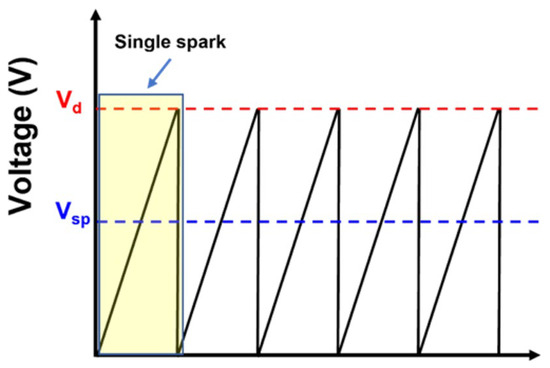 Spark energy E is given by where C is the capacitance of the capacitor employed in the VS-Particle G1 system (25 nF) and Vd is the discharge voltage that is different to Vsp. Specifically, it is the voltage reached between the two electrodes when the spark happens before dropping to zero when the spark is off, and it depends on the carrier gas and the distance between the electrodes. The relation between Vd and Vsp empirically determined is the following [49]: . Figure 9 clarifies the trend of the voltage between the electrodes over five consecutive sparks taken as an example.