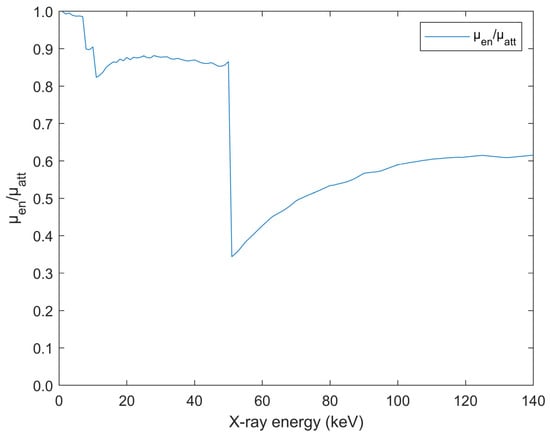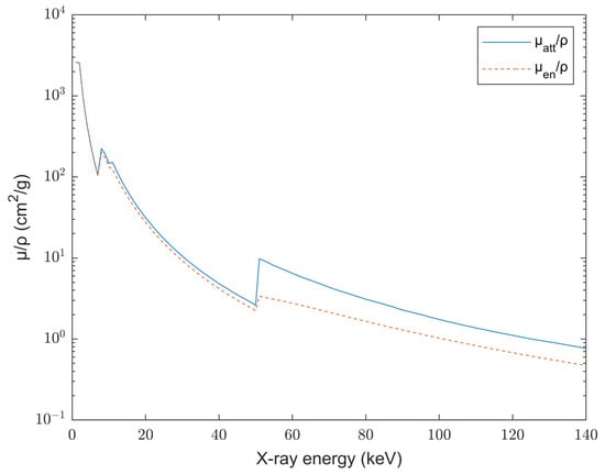 where indicates the X-ray photon fluence, E is the photon energy, is the X-ray total mass attenuation coefficient of the scintillator and is the total mass energy absorption coefficient. is the crystal’s thickness (equal to 10 mm) and is the density (in g/cm3) [46,48]. and were determined by the XMuDat software version 1.0.1 [49].