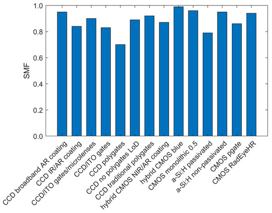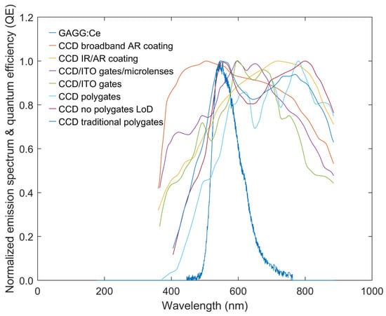 In Figure 4, Figure 5, Figure 6 and Figure 7, the optical emission spectrum of GAGG:Ce in conjunction with the spectral sensitivity of several commercially available sensors are presented. The spectral width of GAGG:Ce crystal was measured to be 315 nm in approximation, from 445 to 760 nm and its emission peak was measured at 545 nm. The normalized emission spectrum was used in Equation (1) to calculate the SMF of GAGG:Ce with the aforementioned sensors. While it can be seen from Figure 4, Figure 5, Figure 6 and Figure 7 that GAGG:Ce emission spectrum is suitable with most charge-coupled devices (CCDs), metal-oxide-semiconductors (CMOS) but not flat panels the SMF was used in order to calculate its compatibility.