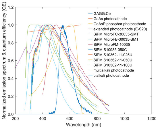 where denotes the spectrum of the emitted light and is the spectral sensitivity of the optical photon detector per wavelength . The crystal’s emission spectrum was measured using a grating spectrometer HR2000+ (Ocean Optics Inc., Largo, FL, USA) under UV excitation.