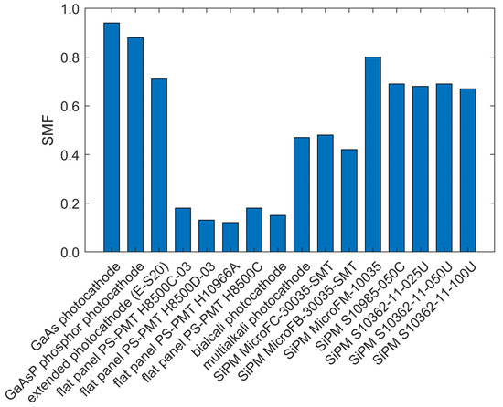 Figure 8 and Figure 9 illustrate the aforementioned compatibility of GAGG:Ce with optical photon detectors. The calculated SMF for each crystal-detector pair is shown. GAGG:Ce exhibits excellent compatibility with all the CCDs examined with the SMF values fluctuating from 0.69 to 0.95. Also, it was deduced that it was particularly suitable with CMOS detectors as demonstrated in Figure 8 with SMF values fluctuating from 0.79 to 0.99 for hybrid CMOS blue which was the highest overall SMF value of all the examined detectors. For different photocathodes and silicon photomultipliers (SiPMs) the crystal’s compatibility was found to vary, as seen in Figure 9. While the crystal is appropriate for applications with optical detectors such as gallium arsenide (GaAs), gallium arsenide phosphide (GaAsP) and the extended-S20 with SMF values of 0.94, 0.88 and 0.71 respectively, it was incompatible with other photocathodes demonstrating SMF values fluctuating from 0.12 to 0.47. Considering SiPMs, compatibility with GAGG:Ce, as shown in Figure 9, it was found to be mostly acceptable except for microFC-30035-SMT (0.48) and microFb-30035-SMT (0.42) that demonstrated especially low SMF values. The material was highly suitable with most of the modern detectors such as CCD and CMOS. This renders it an excellent candidate for systems where the high resolution and low noise levels of the CCD are needed, with potential future applications even in SPECT [11,34,35]. This is illustrated in Figure 8 where the corresponding SMF values were particularly high demonstrating that the material can be appropriately paired with CMOS in applications such as micro-CT imaging, endoscopy, dental applications (like panoramic and cone beam CT) along with other mammographic applications namely positron emission mammography (PEM). It can also be applied in tomography when combined with flat panel and amorphous silicon (a-Si) detectors. Contrarily, its matching factor was inconsistent for various photocathodes and SiPMs. While it showed compatibility with GaAs and GaAsP that find uses in PET it was inadequate with various SiPMs with applications in fast time-of-flight (ToF) PET.