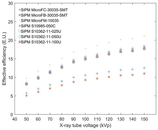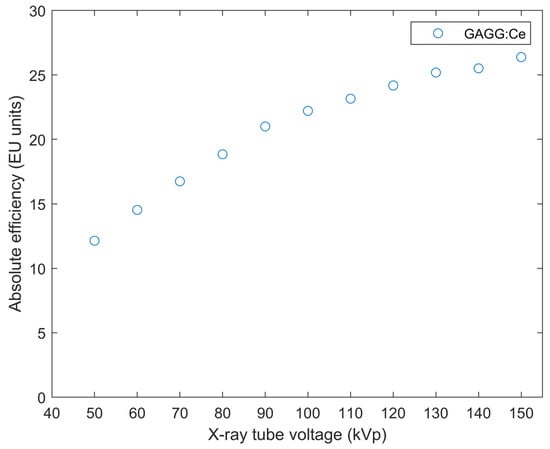 Figure 10 demonstrates the AE values of GAGG:Ce for the tube voltages under investigation. It can be seen that the AE of the crystal is increasing continuously reaching values of 26.3 E.U. for 150 kVp. Under the same exposure conditions, this value is comparable with the AE of cadmium tungstate (CdWO4) [3,4,46] and is higher than the AE of bismuth germanate (BGO) and lutetium yttrium orthosilicate (LYSO:Ce) [3]. AE is increasing in all of the energy range studied as at higher energies photons are more penetrating, thus reaching the detector. AE does not depend on the absorbed energy in the crystal matter but considers all the interactions taking place so it increases even after 100 kVp where Compton scattering is more dominant than photoelectric effect. The high AE values of Figure 10 can also be attributed to the density (6.63 g/cm3) of the crystal as a high density affects the probability of interactions within the crystal matter.