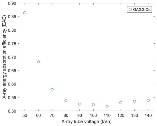 expresses how probable is for the photons to interact with the single crystal and be absorbed while expresses how probable is for the energy to be transferred and be absorbed by the scintillator matter. Both are indicative of how the X-rays interact with the crystal. In Figure 3 the ratio of used in Equation (3) is presented. The ratio may be considered as an expression providing the effectiveness of energy absorption per photon interaction. The vertical drop at 50.23 keV corresponds to the GAGG:Ce K-edge of Gd in correlation with the discontinuity found at the same energy range in Figure 2. After 50 keV the ratio presents an increase until 110 keV where it stabilizes (~0.6). This affects EAE and explains the slight increase in EAE values after 110 kVp.