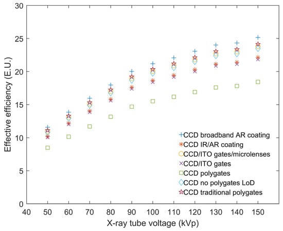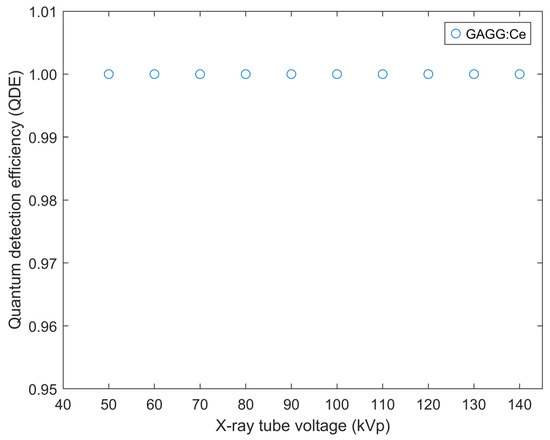 QDE indicates the X-ray photons that interact with the scintillator, thus denotes the efficiency of a detection system. Ideally for scintillators used in medical imaging it should be as close as possible to 1.0, ensuring low noise levels and lower radiation dose to the patient. In our case, GAGG:Ce exhibited QDE values equal to 1.0. For our testing tube voltage range the quantum efficiency was higher than the energy absorption efficiency due to the fact that QDE factors in all the possible X-ray interactions that occur in the crystal length such as Compton scattering, braking radiation and the K characteristic radiation.