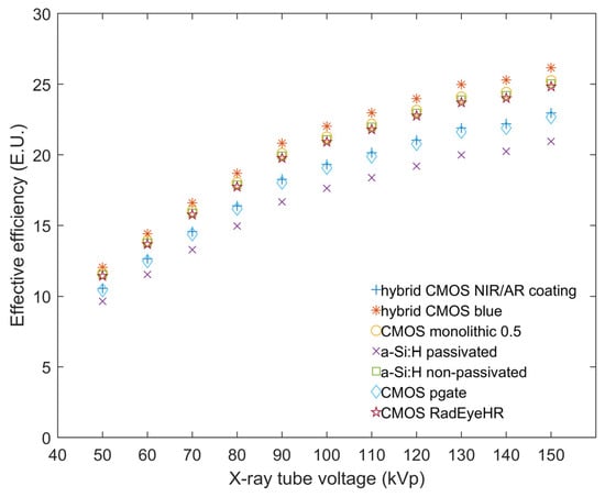 The crystal’s quantum detection efficiency for the tube voltages under investigation is shown in Figure 12. The crystal presents perfect efficiency in detecting the photons for tube voltages up to 140 kVp. The photons generated in the crystal surface, traveling in the material, transfer and consequently, deposit a portion of their energy as secondary electrons which is why the EAE in Figure 11 is highly affected by the energy that is absorbed locally and the photon fluence used in Equation (3). The photon energy spectrum was generated with the TASMIP algorithm which is commonly used to calculate the X-ray spectra in applications such as CT, thus the maximum tube voltage in EAE and QDE calculations was up to 140 kVp, albeit the experimental irradiation of the crystal, in our study, had a tube voltage range of 50 kVp to 150 kVp. The slight increase of the EAE values after 100 kVp hints the crystal’s suitability in applications like CT imaging and radiography that require high energy levels. The incline of EAE is also ascribed to the ratio presented in Figure 3.